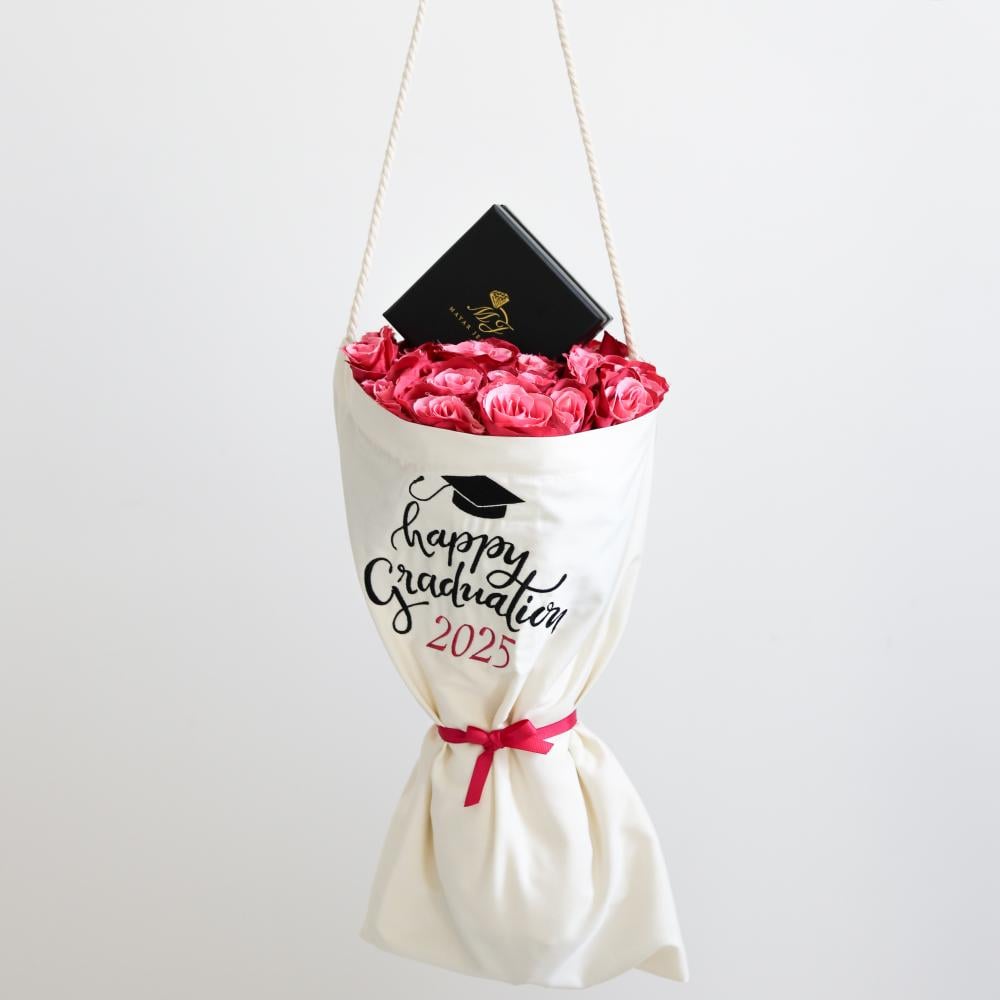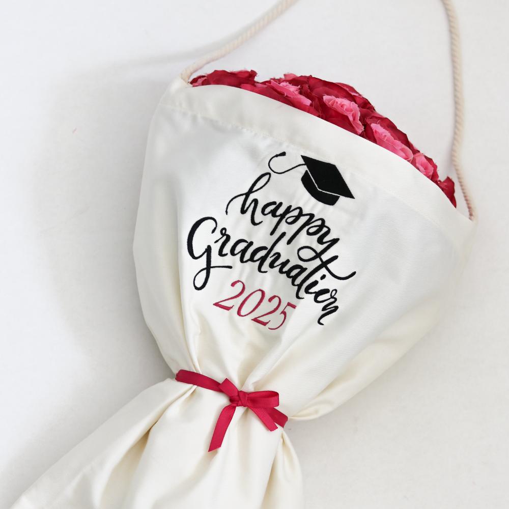 شنطة مغلفة بشكل انيق تحمل بداخلها الورد ، مطرزة بعبارة تخرّج بجودة عالية الدقة