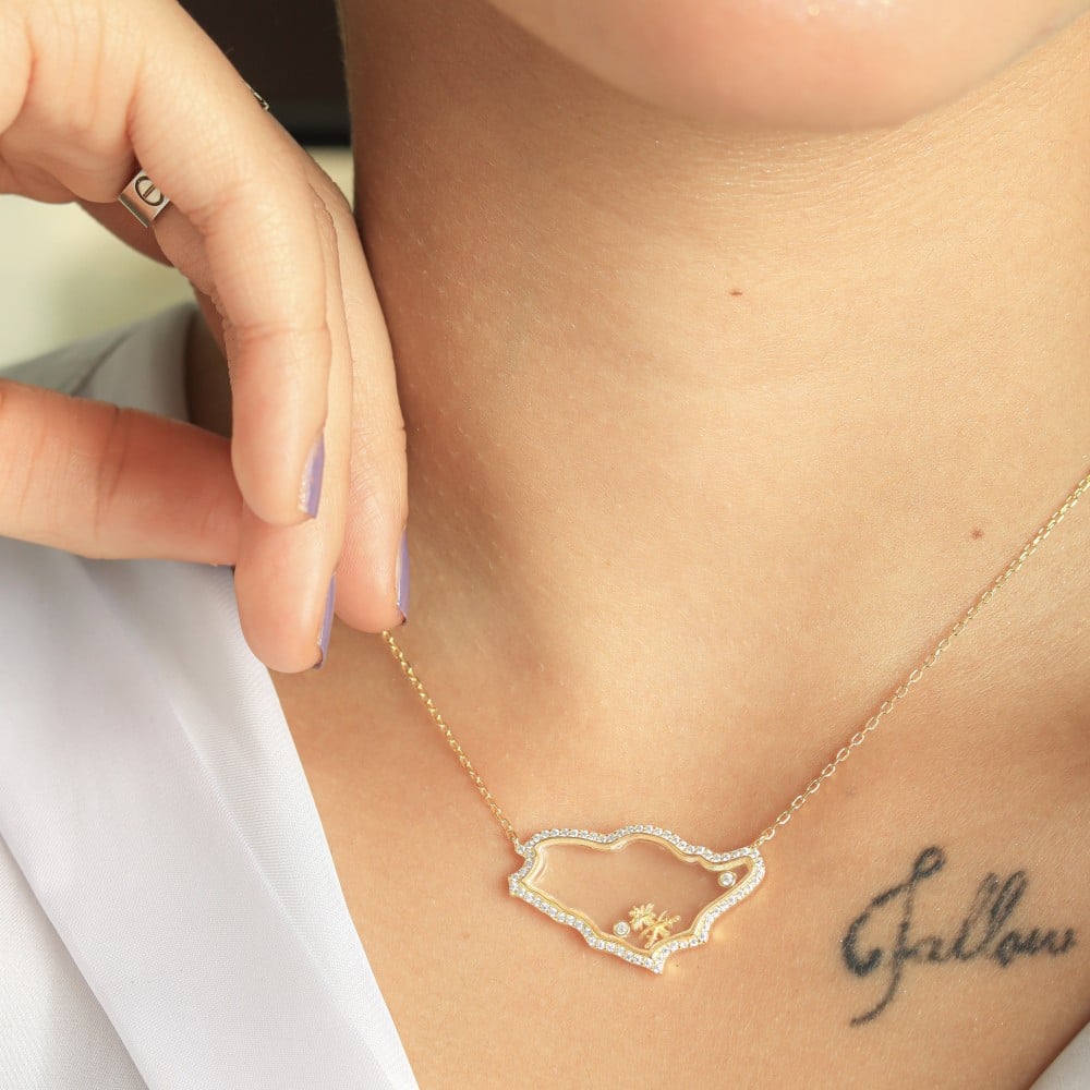 سلسال أنيق بتصميم خريطة المملكة العربية السعودية، مُرصّع بزركون لامع يُحيط بالخريطة من الخارج، بينما يزين الداخل شعار المملكة بدقة وفخامة. مصنوع من الفضة الخالص عيار 925 ، ليجمع بين المعنى العميق والانتماء والأناقة في قطعة واحدة مثالية للإهداء أو الإطلالة اليومية.