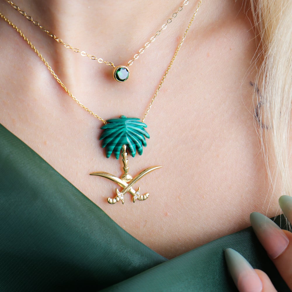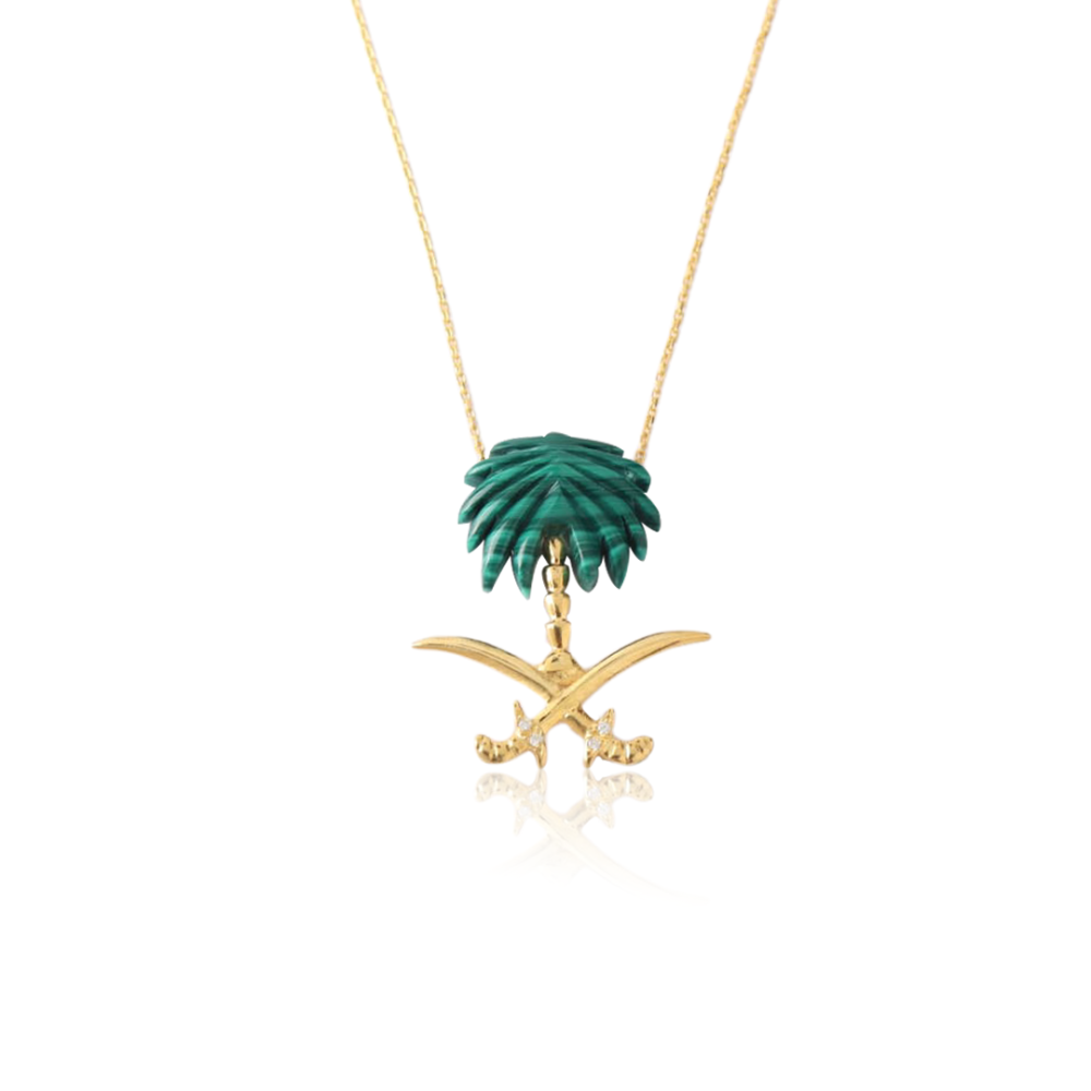 سلسال أنيق مستوحى من شعار المملكة العربية السعودية، يجمع بين السيفين المتقاطعين والنخلة في تصميم متقن يعبّر عن القوة والرخاء. مصنوع من الفضة الخالص عيار 925، ليمنحك إطلالة فاخرة تحمل معاني وطنية عميقة.